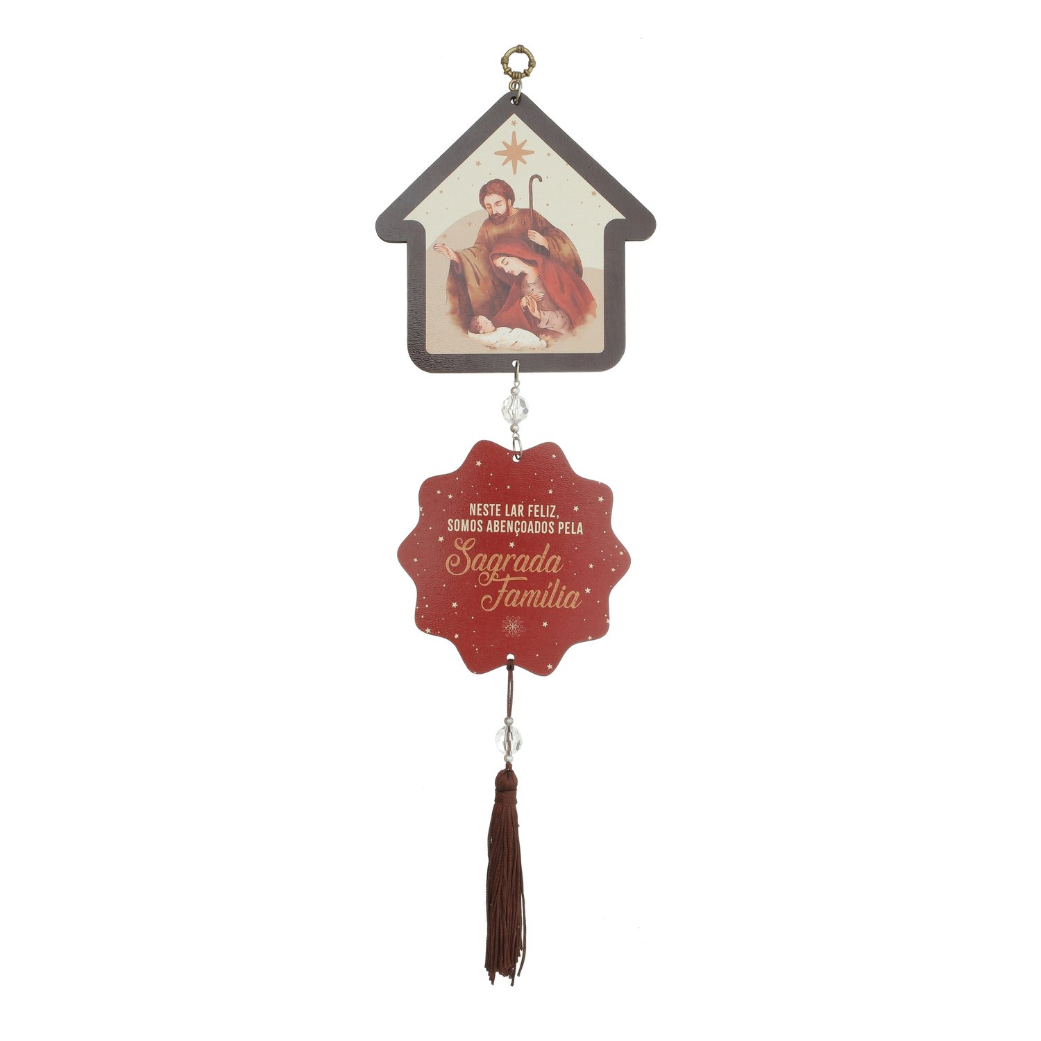 Adorno duplo para parede com modelo natalino em MDF tamanho P, contém um pompom marrom escuro e duas peças: uma em formato de casa com a figura da Sagrada Família e outra em formato de estrela com fundo vermelho e inscrição Neste lar somos abençoados pela Sagrada Família. Há também contas translúcidas e uma argola em ouro velho.