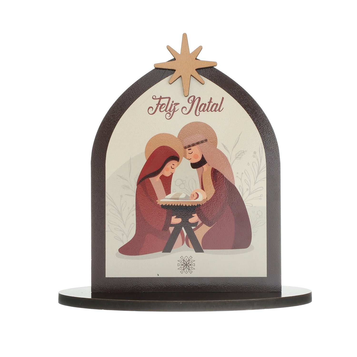 Capela de Natal em MDF marrom escuro com a imagem da Sagrada Família. Acima da Santa Família é possível observar a inscrição Feliz Natal. E em amarelo sobreposto, uma estrela.