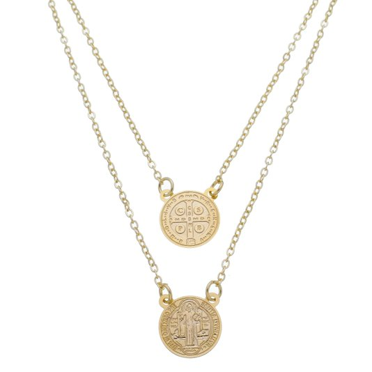 O acessório é inteiramente dourado, e nele contém duas medalhas redondas: cada uma delas mostra um lado da Medalha de São Bento (a parte de trás delas é liso).