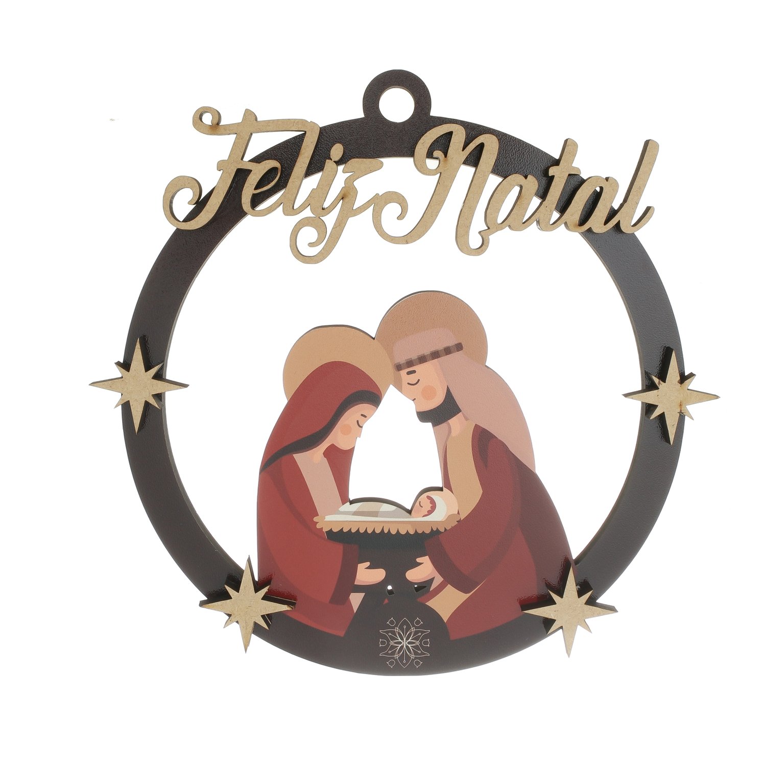 Guirlanda de Natal em MDF marrom escuro com imagem colorida vazada da Sagrada Família no meio e a inscrição Feliz Natal em MDF cru na parte superior da peça, também, 4 estrelas nas laterais inferiores.